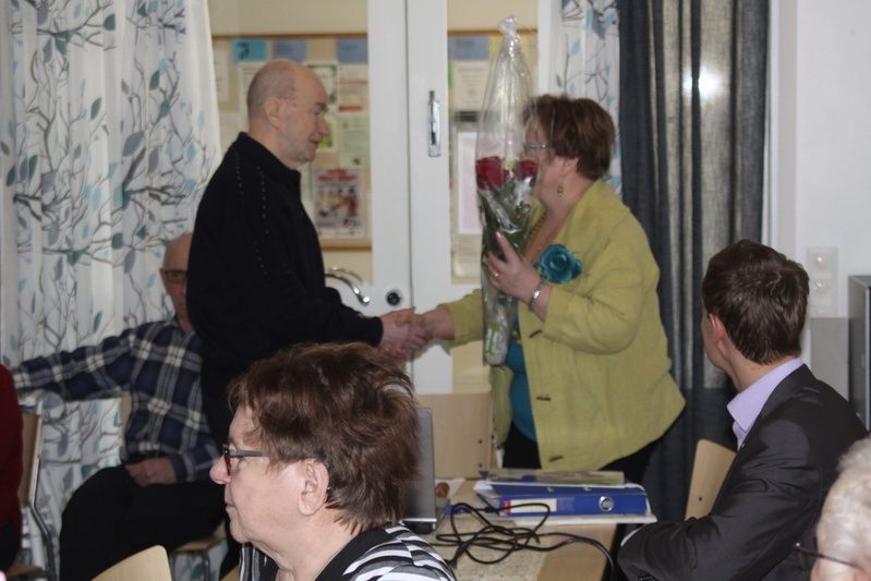 Polvijärven Eläkkeensaajien Juhlakokus 10.4.2014 Vapaa-aikatalolla.Hallituksen sihteeri Anja Hyvärinen ojensi kukat hallituksen Puheenjohtaja Matti Kettuselle ansiokkaasta työstä liikunnan hyväksi.