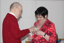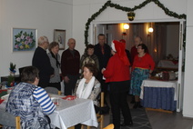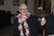 Puheenjohtaja Matti Kettunen toivotti osallistujille iloista pikkujoulua. |  Anjalla oli hauska leikkimielinen kilpilu.Anja lauloi alun ja jokainen jatkoi vuorollaan jos osasi. |  Pirkolla oli kiva kilpailu.Matti avustajana (olikohan mieleistä)....Piti arvata miten pitkälti Matti veti liinaa sieltä jostakin.... |