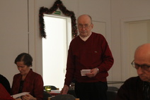 Puheenjohtaja Matti Kettunen toivotti osallistujille iloista pikkujoulua. |  Anjalla oli hauska leikkimielinen kilpilu.Anja lauloi alun ja jokainen jatkoi vuorollaan jos osasi. |  Pirkolla oli kiva kilpailu.Matti avustajana (olikohan mieleistä)....Piti arvata miten pitkälti Matti veti liinaa sieltä jostakin.... |